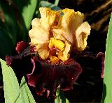 Кремово-золотистые стандарты с узкой золотисто-коричневой каёмкой, темные сливово-бордовые фолы с небольшим светлым пятном под золотой бородкой